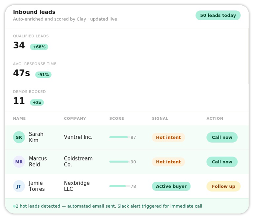 We configure your Clay workspace with enrichment waterfalls, connect your form tools (Typeform, HubSpot, etc.), build the qualification scoring logic, and wire SDR notification flows via Slack and automated email sequences.